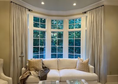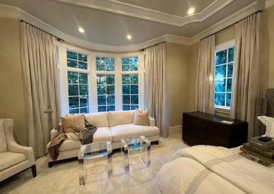 The neutral, monochromatic color scheme brings a sophisticated touch to this primary bedroom, contributing to a serene, calming atmosphere. The understated hues complement the room’s decor without overwhelming it, allowing the other design elements to shine while maintaining a cohesive, polished aesthetic. Together, these custom draperies elevate the entire space, making it feel both inviting and elegantly appointed.